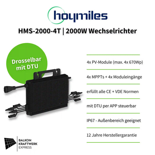 Die über einer Leistung von 800W liegenden Hoymiles Wechselrichter HMS-1000-2T, HMS-1600-4T, HMS-1800-4T und HMS-2000-4T können z.B. mit einer DTU auf die gültigen 800 Watt Einspeisegrenze gedrosselt werden.